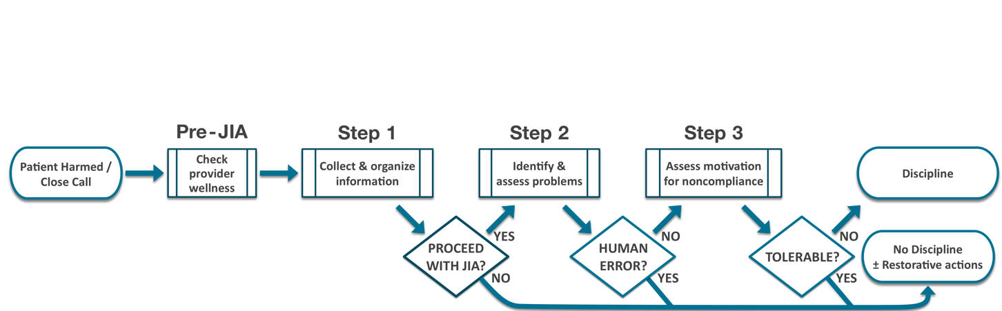 The JIA is an important piece of a health system’s just culture which in turn is a cornerstone of a safety culture. The JIA process provides managers and regulators who are involved in assessing the decisions and actions of an individual involved in a patient safety event with a framework, and tools to complete the task fairly. In a JIA there is one pre-step, three steps, and three decisions. The last decision is deciding about discipline (Figure).